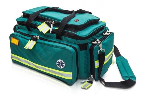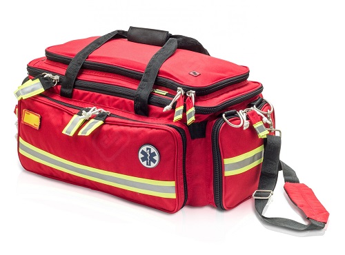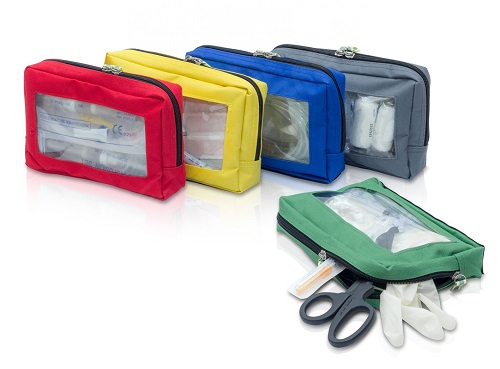 It has several detachable compartments in different colours. 2 external pockets, both marked differently for adult and pediatric material