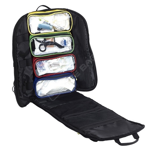 It includes a detachable compartment that can be used as a waist bag for triage and personal belongings.