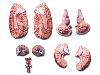 This life size  model can be divided into 9 parts showing the temporal and occipital lobes, the frontal and parietal lobes, the cerebellum, the brain stem and basilary artery.