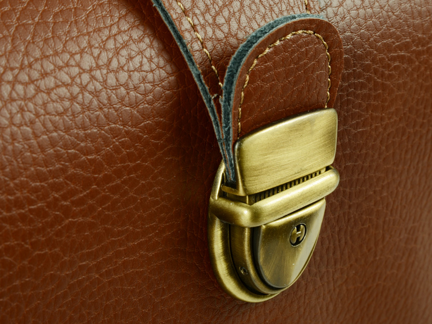 Rigid bottom, inside pocket with button fastening, burnished lock.