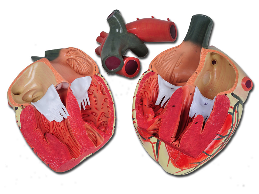 This model of a heart shows internal structures including the cardiac valves and the comparative morphology of the right and left ventricles.