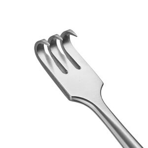 Retractor with  angled, blunt end and, at the opposite end, facing the opposite direction it has a three prong, sharp rake tip.