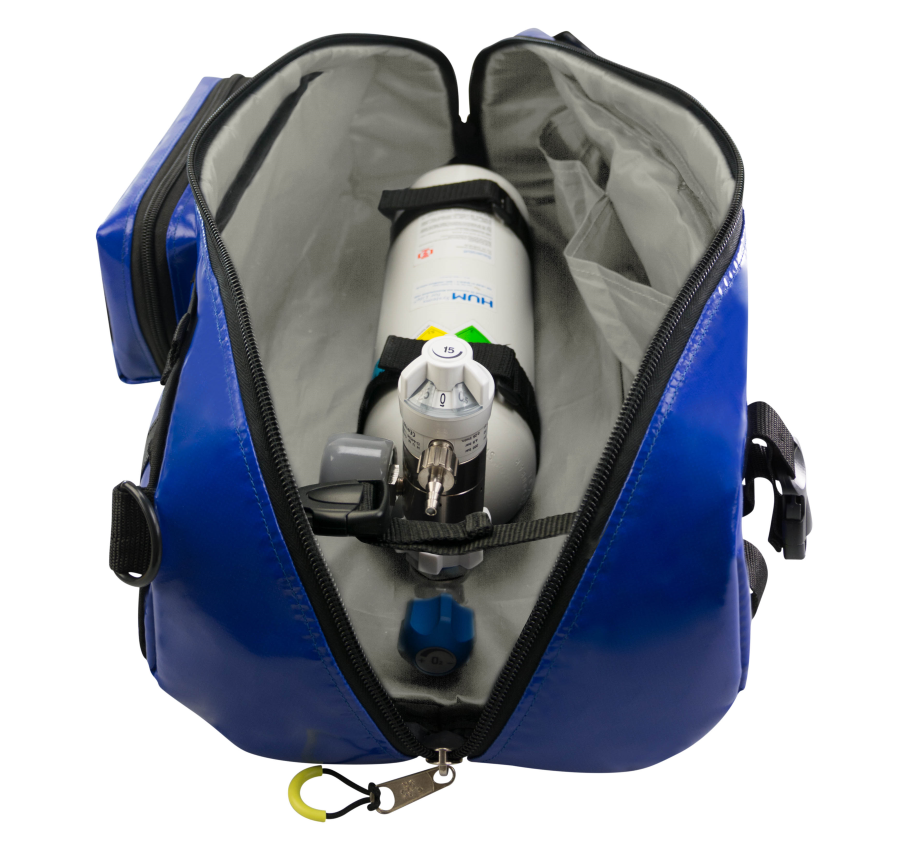 Clamping straps restrict the maximum opening of the bag, helping to keep the oxygen bottle in place.