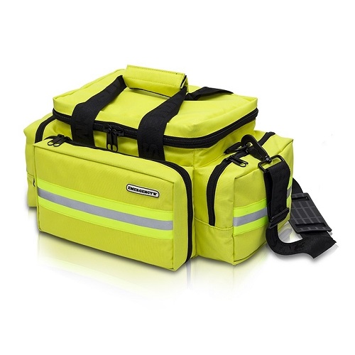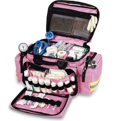 Bag with two adjustable internal dividers and a mesh pocket on the flap to facilitate the organization of the first aid  material.