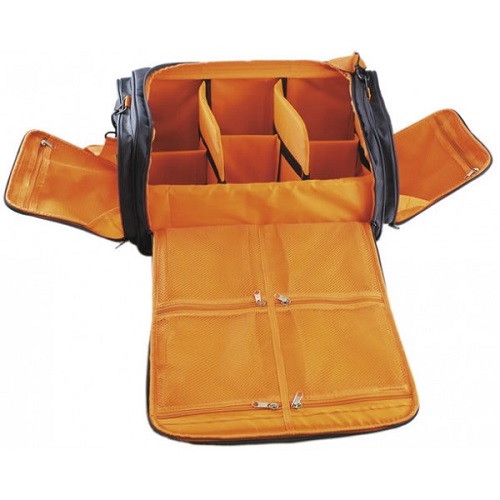 2  side pockets, 1 with mesh pockets, and the other with compartments
