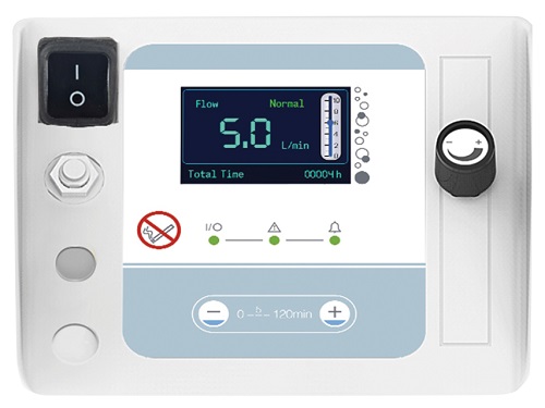 Small and portable oxygen concentrator composed of air compressor, absorption tower of molecular sieve, sensor and flowrate controller.