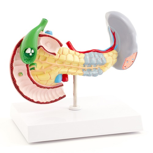 This anatomical model shows a life-size representation of a diseased human pancreas, gallbladder, spleen and duodenum system with