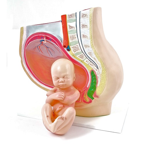 This pregnancy model  shows the female lower abdomen with a foetus shortly before birth