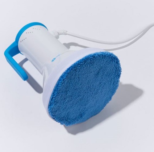 The Myobuddy Pro 2 massager includes white bonnet for dry use and one blue bonnet for oil or lotion.