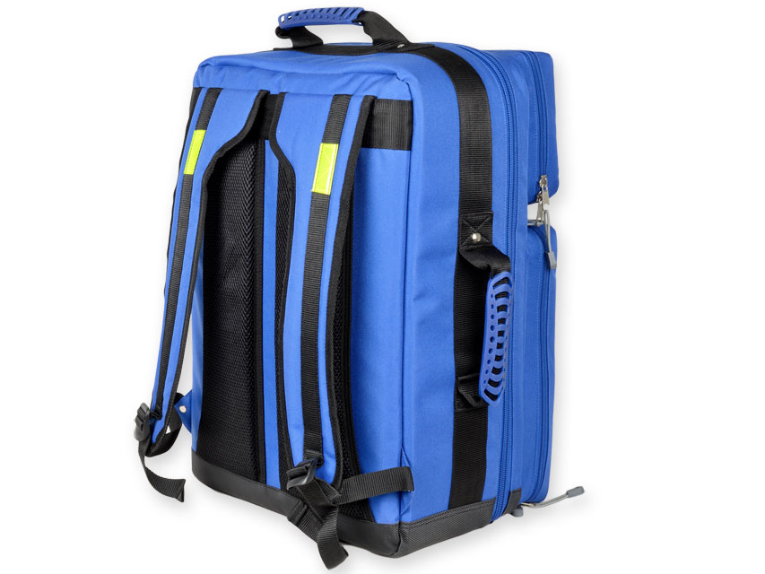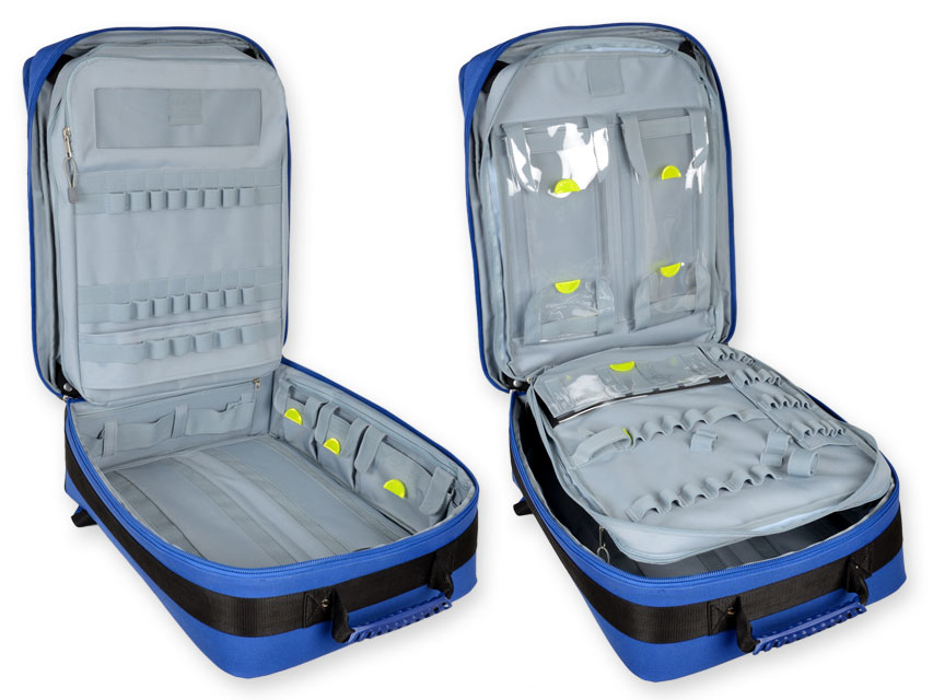 Two external pockets with elastic strips and velcro strips: one 35x16 cm, one 35x32 cm with 4 internal transparent pockets
