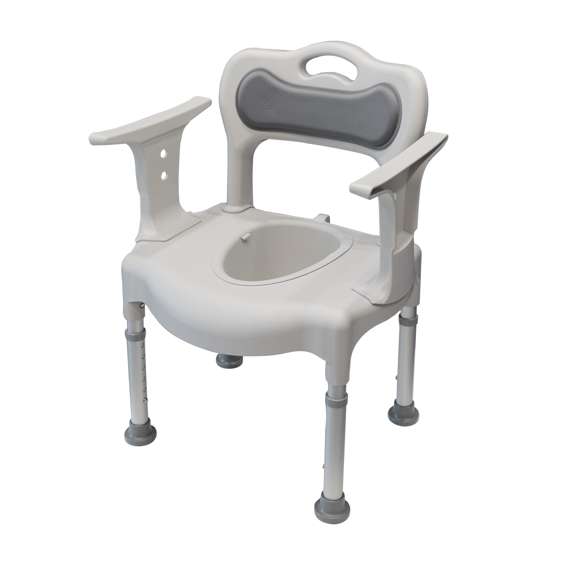The Suva is a stationary, modular shower and commode chair. It features a detachable backrest and armrests to facilitate user preference and side transfers.