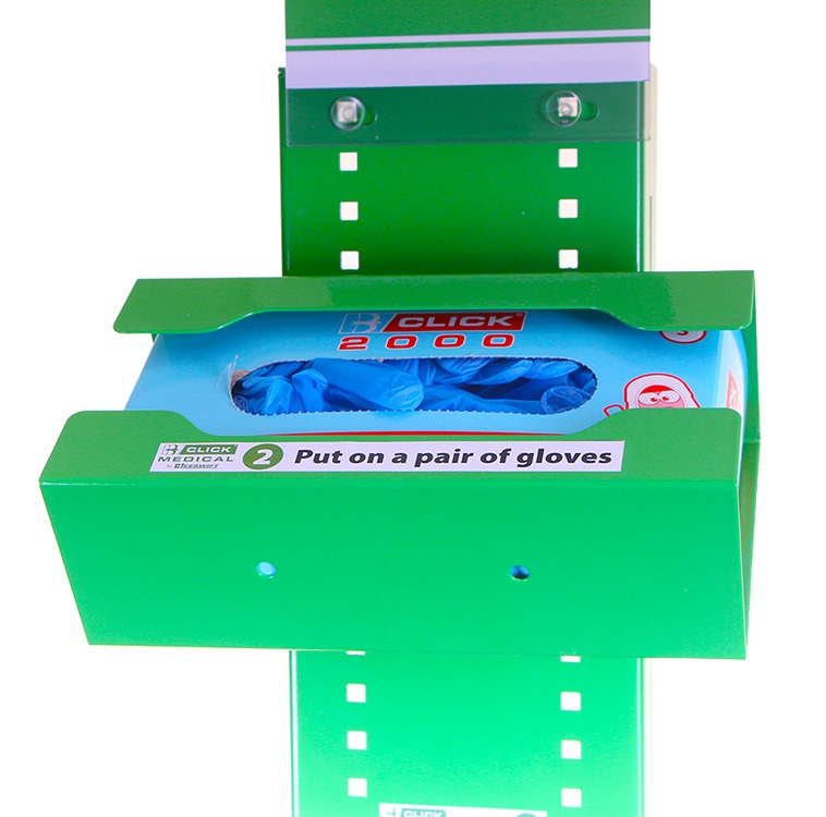 Step 2 – Put on a pair of gloves. This little attachment enables you to insert a box of protective disposable gloves that can be removed without the need to touch anything else like the box or holder.